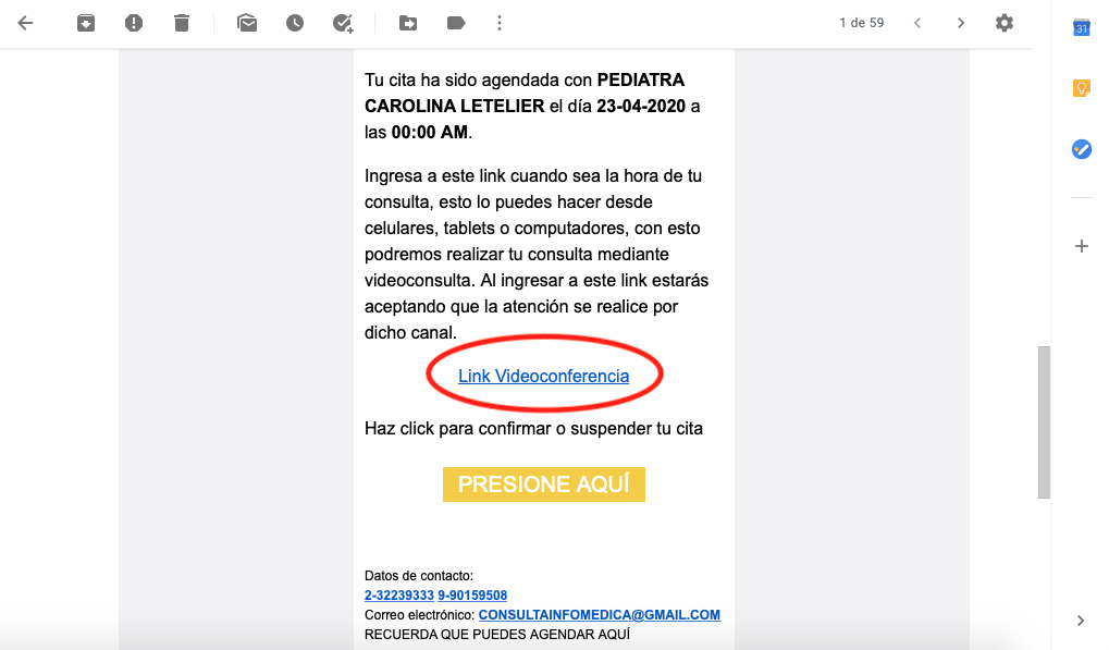 Paso 1: En el correo electrónico que le enviamos para confirmar la hora, se adjunta un Link de acceso a la plataforma virtual Whereby.