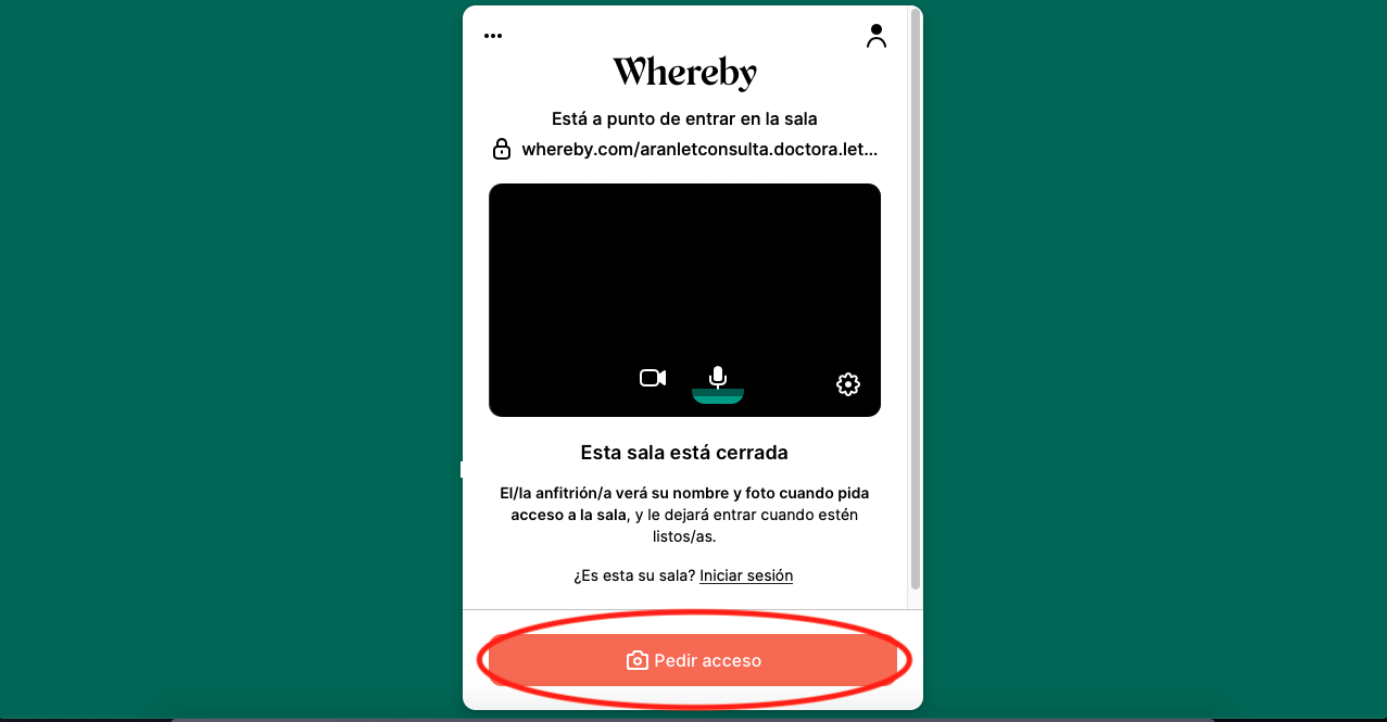 Paso 3: Una vez autorizado el acceso al micrófono y cámara del dispositivo, deberá pedir acceso al profesional, indicándole que está listo para la Videoconsulta, presionando el botón rojo.